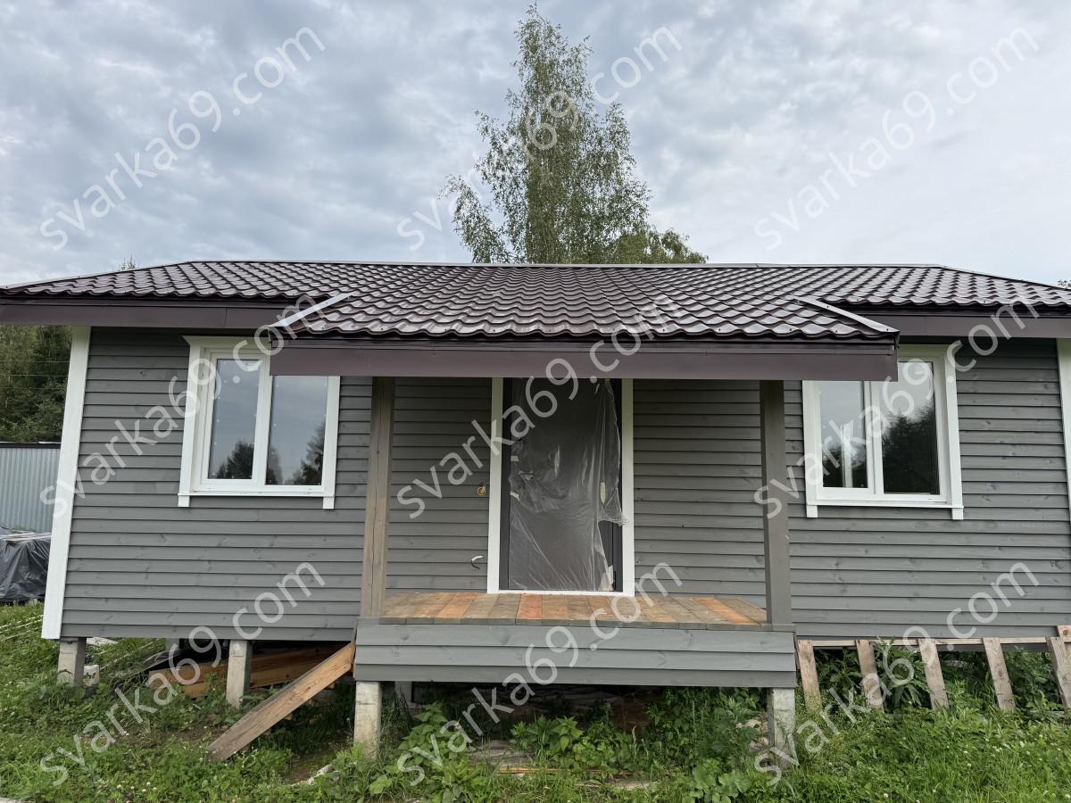 СК "Дом и Дача" выполнила работы строительству каркасного дома. Для фундамента использованы ж/б сваи, каркас дома сделан из сухой строганной доски, кровля - металлочерепица, обшивка стен снаружи имитацией сухой строганой доской, внутри вагонкой-штиль.